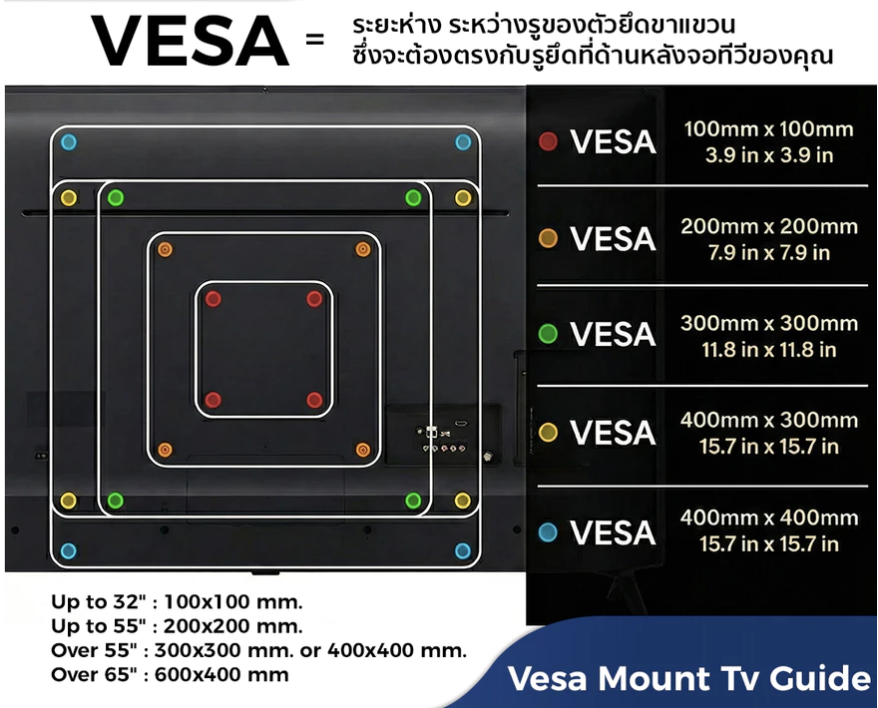 - รองรับขนาดรูยึดด้านหลังจอ : 200 x 200, 300 x 200, 300 x 300, 400 x 200, 400 x 300, 400 x 400, 600 x 400 มิลลิเมตร